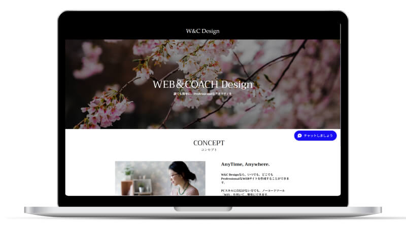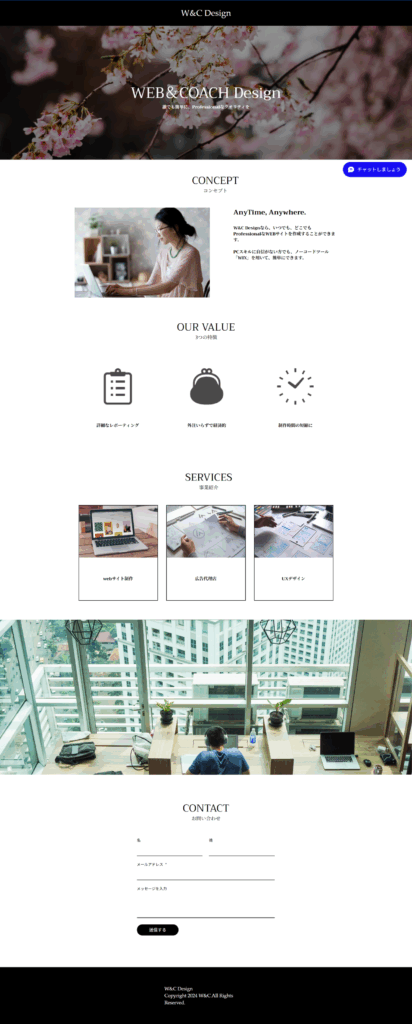 見本のデザインを参考に、ノーコードツールWIXでの実装を担当しています。背景は白・黒を基調にシンプルに構成し、右下に配置したお問い合わせボタンを鮮やかな青色にすることで、際立つようにデザインしています。