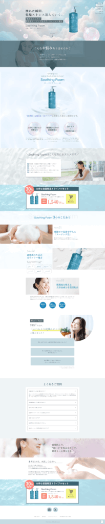 高保湿で泡タイプのボディソープという特徴を踏まえ、ユーザーに“みずみずしさ”や“うるおい”を直感的に感じてもらえるよう、全体のデザインを意識して構築しました。購買層を考慮し、要所に女性のイメージカットを配置することで使用シーンをより想像しやすい構成にしています。また、CTAについては目を引きやすいよう他要素よりも鮮やかな色を用い、自然と視線が流れるように差別化を図っています。